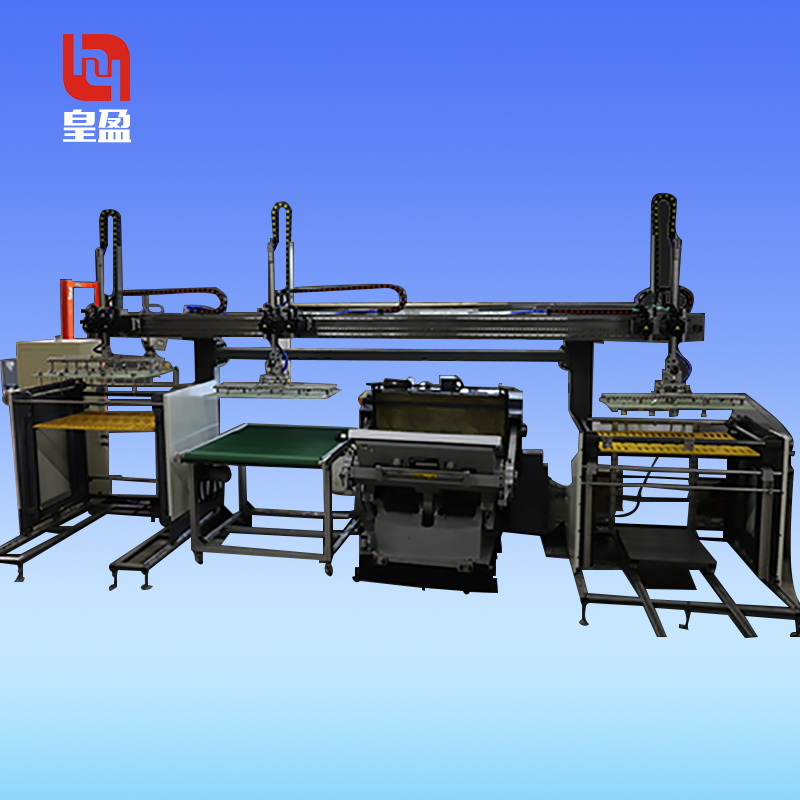 皇盈的压痕机机械手的优点,皇盈压痕机机械手对压痕的材质没有局限性,不管是卡纸,灰板,还是胶片,PVC,瓷片,铜版纸这些我们都可以模切,全穿半穿都可以模切,调机时间短,并且模切瓷片的时候不会被刮花,你原来是多大规格的模切机,东莞皇盈自动化设备有限公司经过研发和改进的压痕机机械手,大大节省了人工成本,一人可看两到三台机,节省了时间,给企业减轻了压力,提高了生产效率。压痕机机械手主要和压痕机,烫金机,切线机,模切清废机,吊牌模切机配套使用.压痕机机械手具有自动模切,清废,上料,收料功能,智能清废机械手对模切机的规格没有多大要求,刀模也没有多大要求,并且可以自动上料,下料,还有清废功能,压痕机机械手适用于各类大小规格的纸张的模切,包括且不限于80g书纸、120g-157g双铜纸、200g-500g白板纸、600g-1200g灰板纸、瓦楞纸、0.2MM以上的胶片等。采用PLC控制,触摸屏人机界面,参数式设置及故障显示;推规使用伺服电机,精度+/-0.2mm;调试只需十分钟,操作安全简单,单人可同时看4-5台机;上料、模切、清废、收料,四工位三轴设计,速度达1000张/小时。